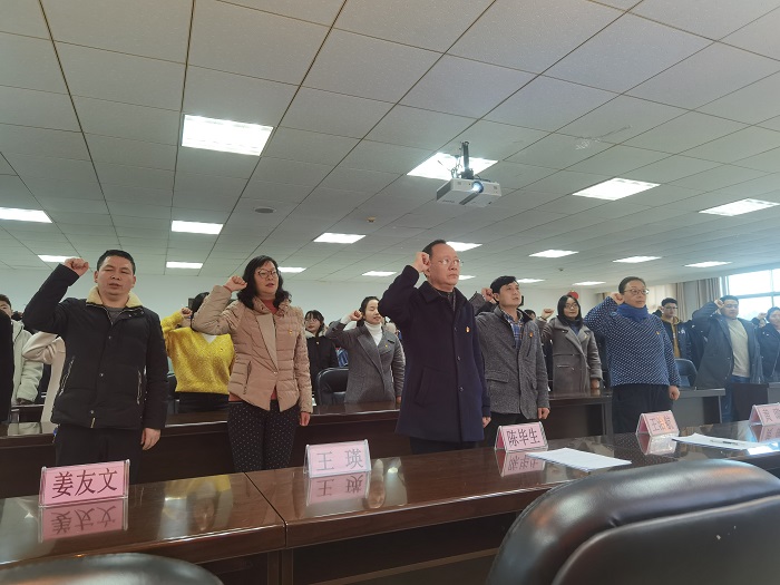 陈毕生、王治航黄暐、王瑛、以及各党支部书记为新党员佩戴党徽。由陈毕生带领全体新党员宣誓,大家列队整齐,共举右手,在党旗下庄严承诺。