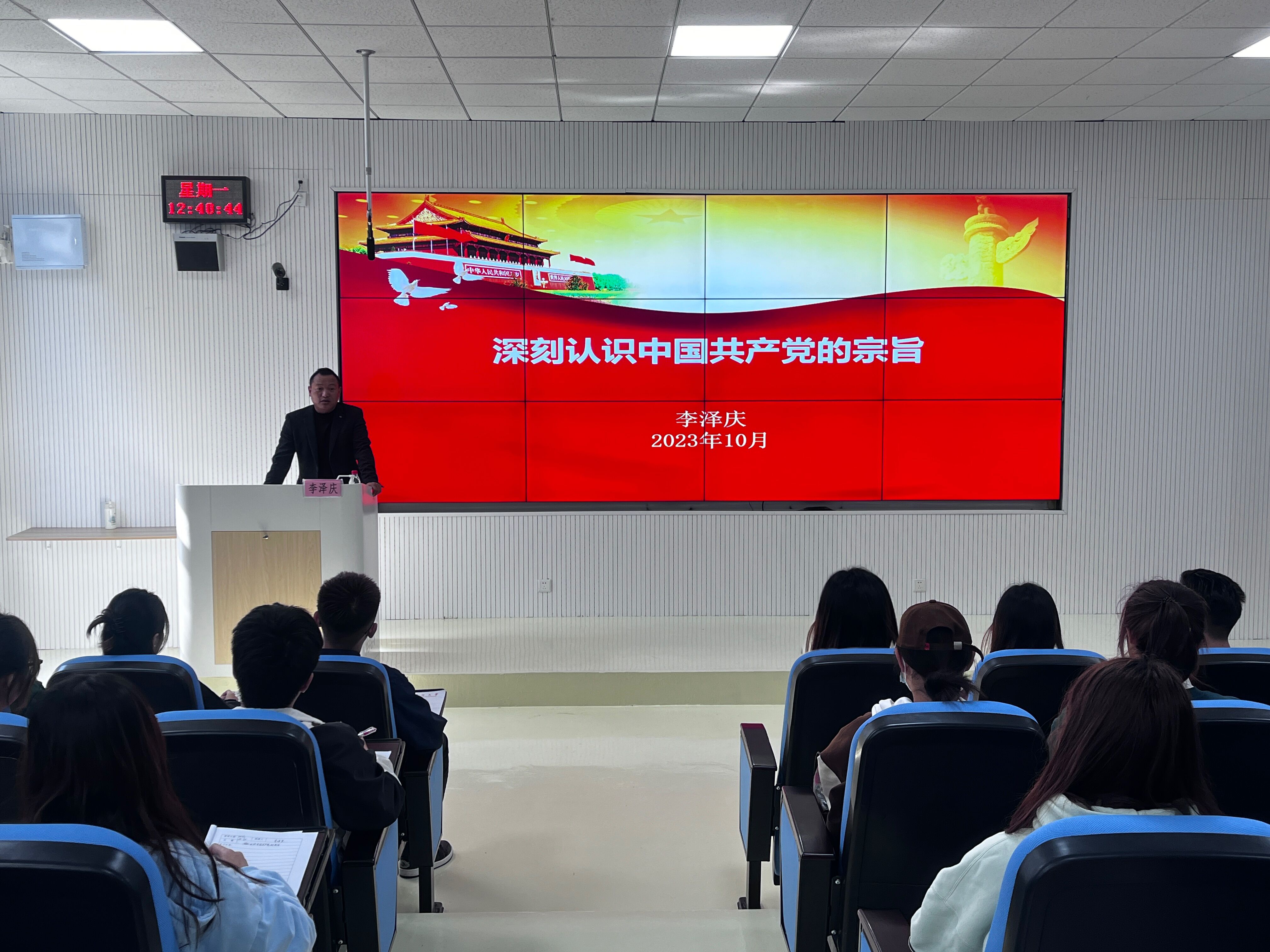 (永利3044集团官网 陆晓莹 付宇坤 报道|摄影 杨仕豪)10月30日,国际公司党校在乐学楼101教室开展“深刻认识中国共产党的宗旨”专题党课。公司党委组织部组织科科长李泽庆主讲,2023年秋季入党积极分子培训班全体学员参加。