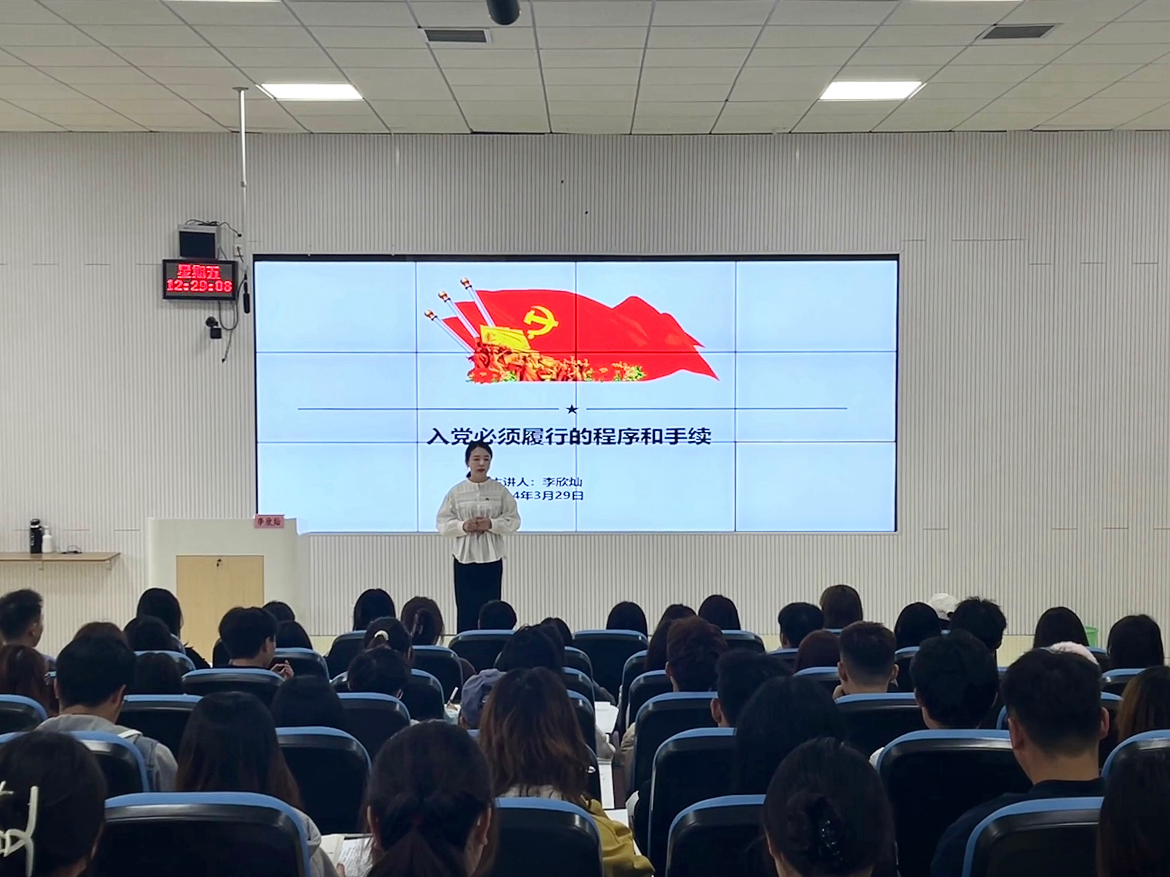 (永利3044集团官网 陆晓莹 报道|摄影 黎子豪)3月29日中午,永利3044集团官网专职组织员李欣灿在乐学楼201教室为2024年春季入党积极分子作《入党必须履行的程序与手续》讲座。