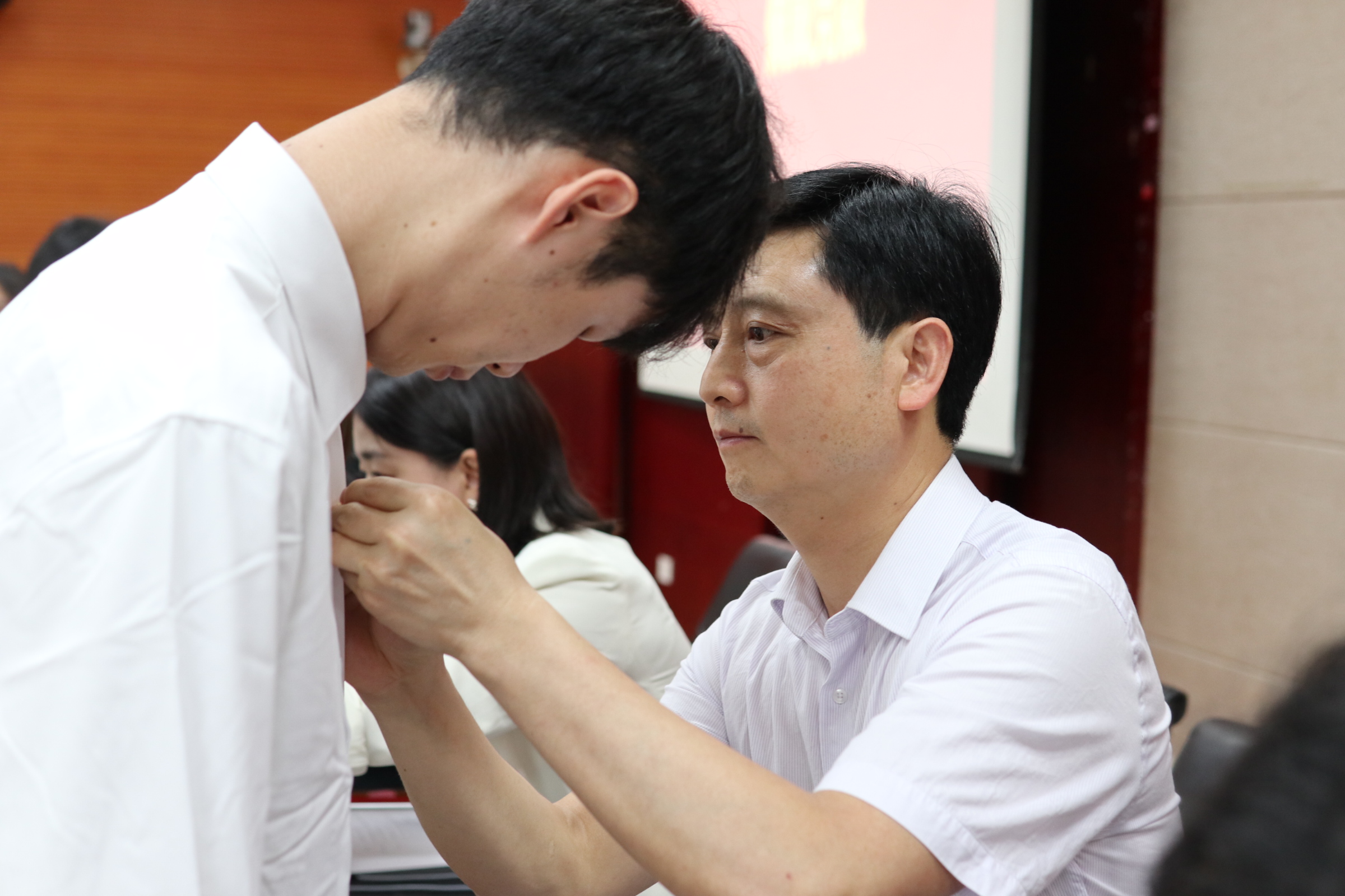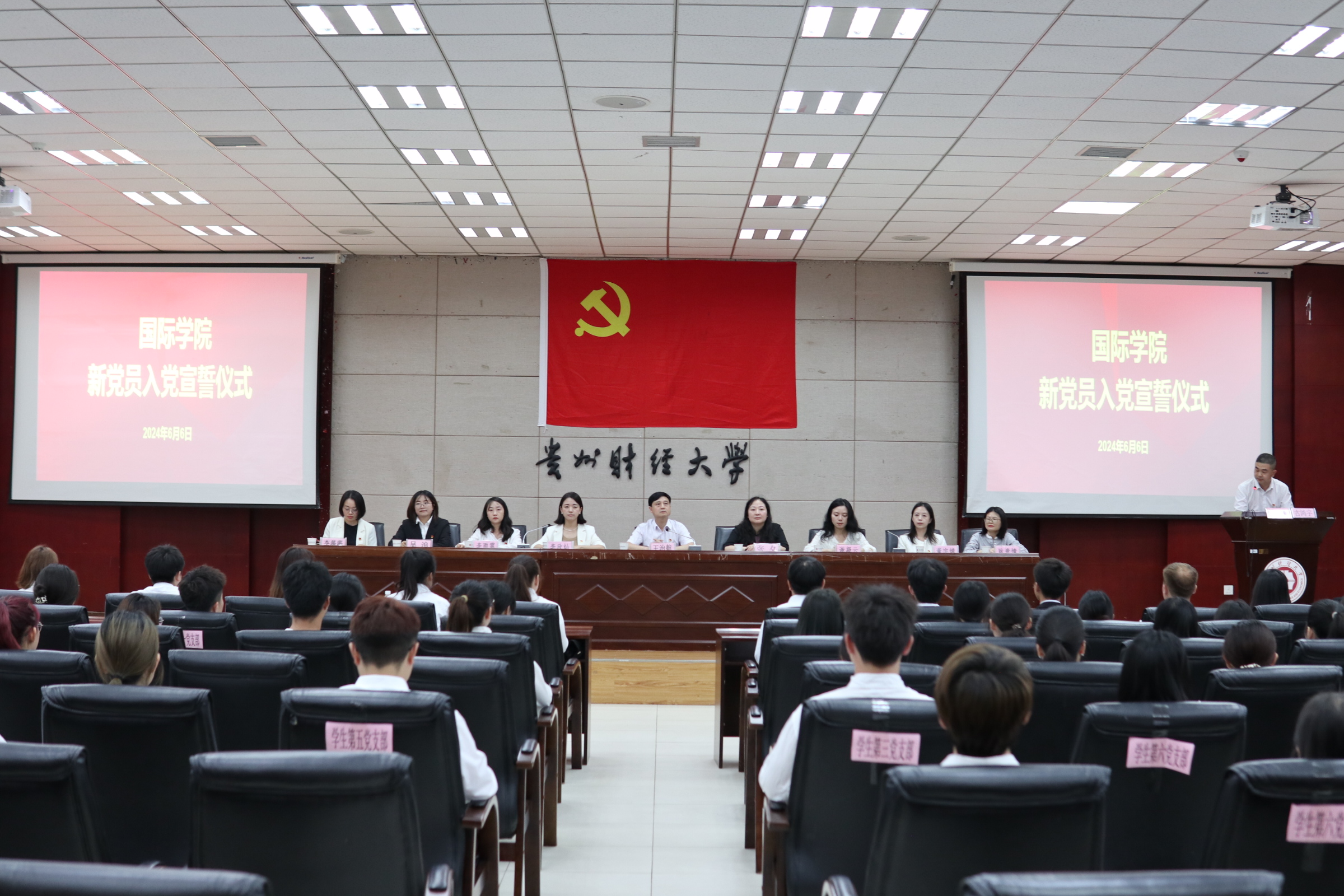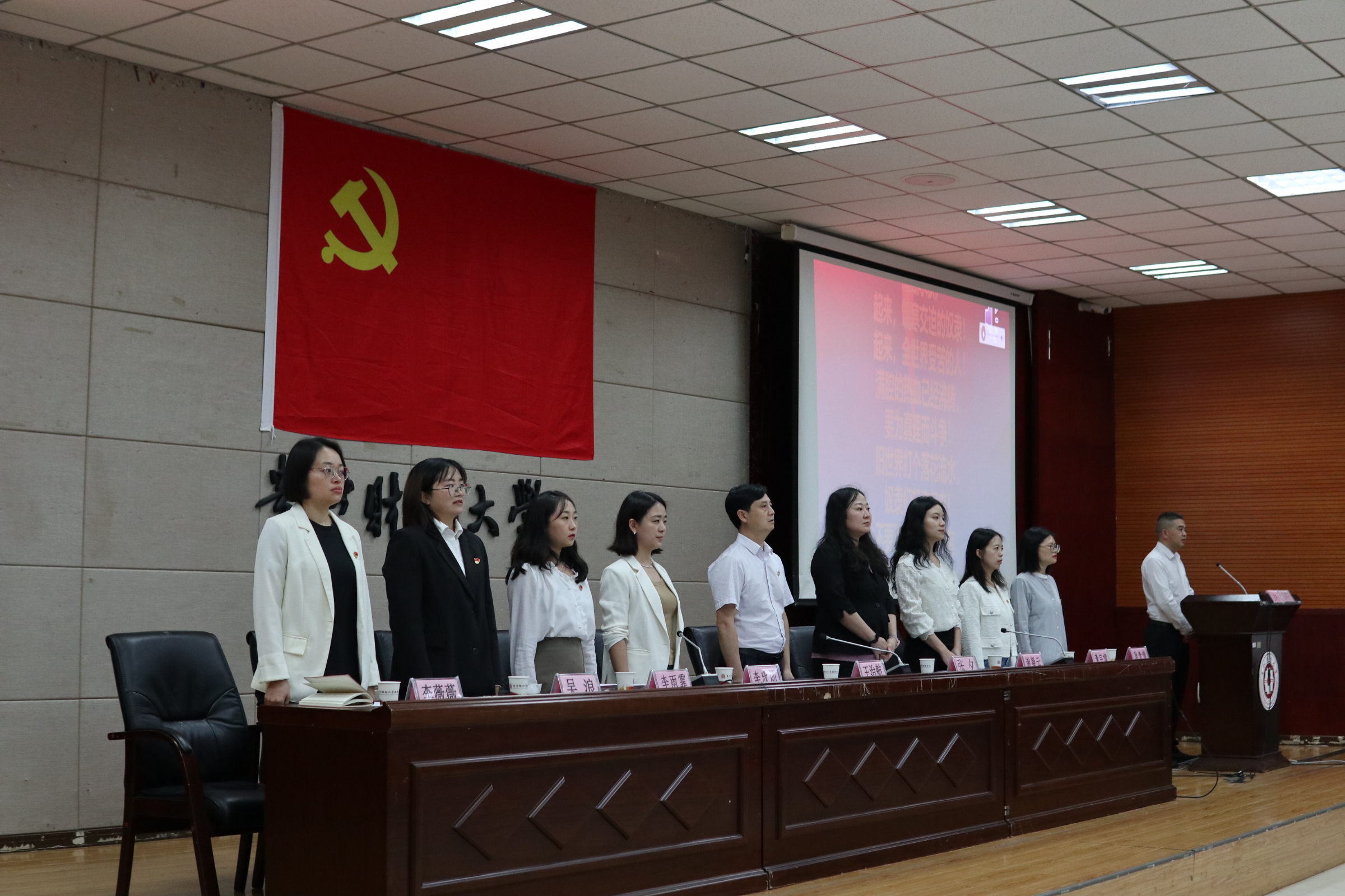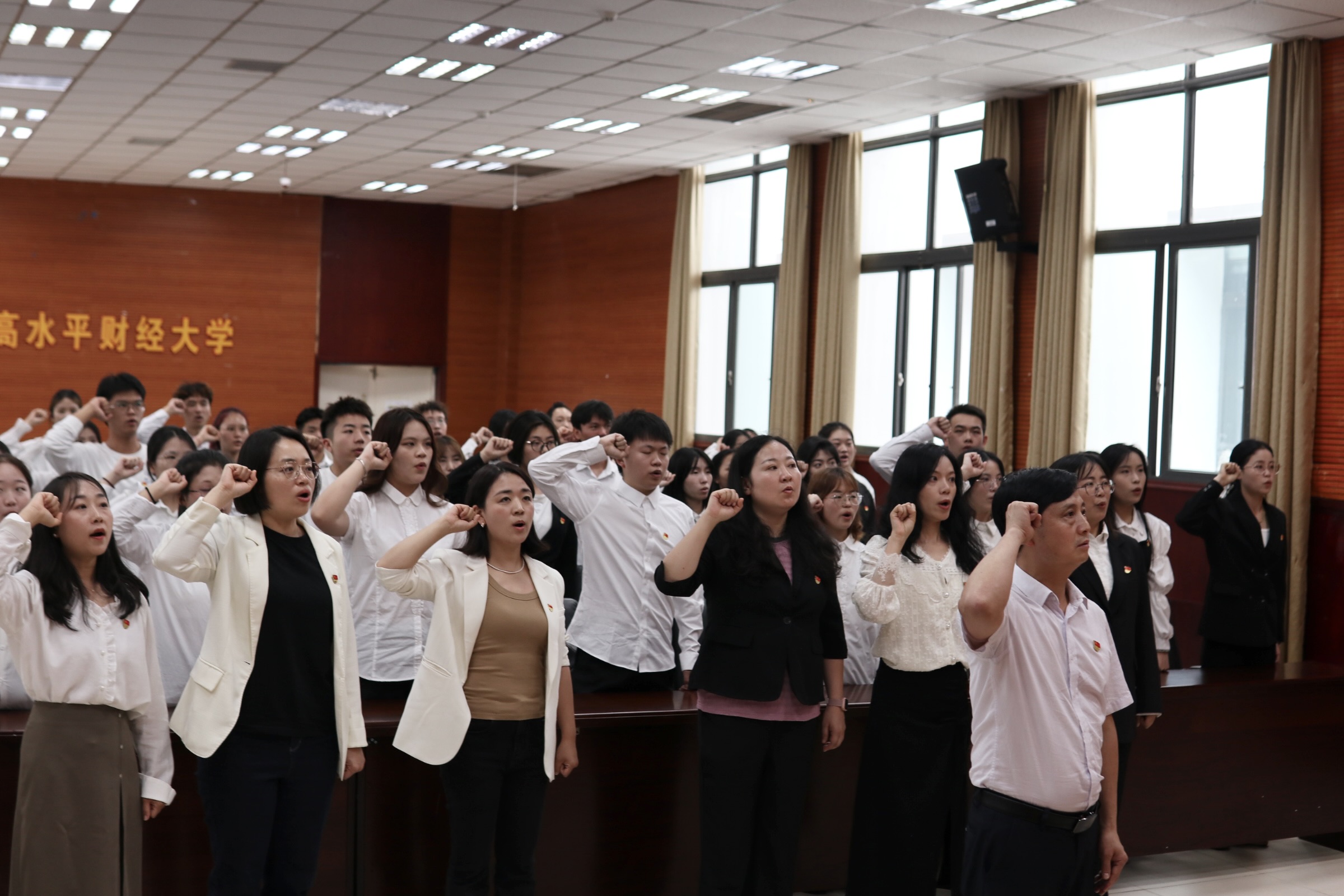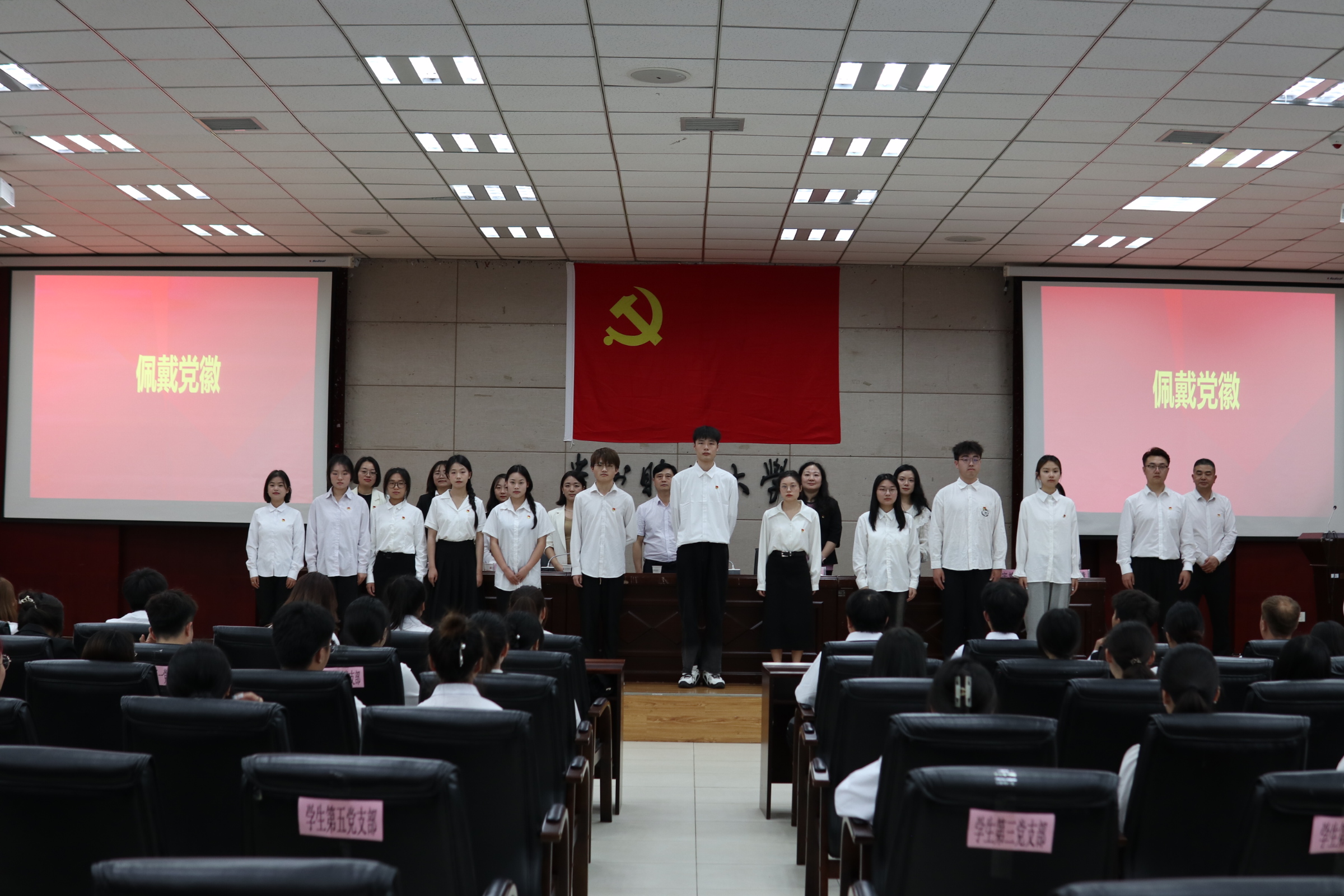 组织员李欣灿宣读批复文件和新党员名单,全体老师们为新党员逐一佩戴党徽并表示祝贺。随后82名新党员举起右拳,面向党旗庄严宣誓。在激昂的宣誓声中传递着他们昂然向上的斗志和为共产主义事业奋斗终身的决心。