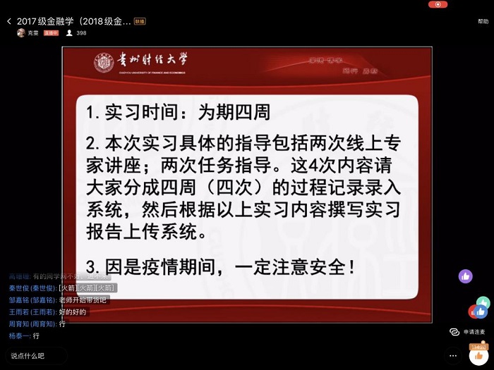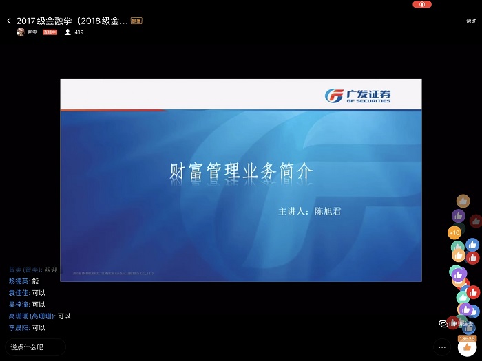 (永利3044集团官网 刘俊杰 图文报道) 7月14日上午十点,广发证券贵阳营业部财富管理部业务总监陈旭君,通过钉钉群直播的方式,以“财富管理业务”为题,为永利3044集团官网2017级金融学(中外合作办学)、2018级金融保险专业员工做了一场线上专业实习讲座。讲座由大数据应用与经济公司老师张克雯博士主持, 400余名员工参与了此次精彩的线上讲座。
