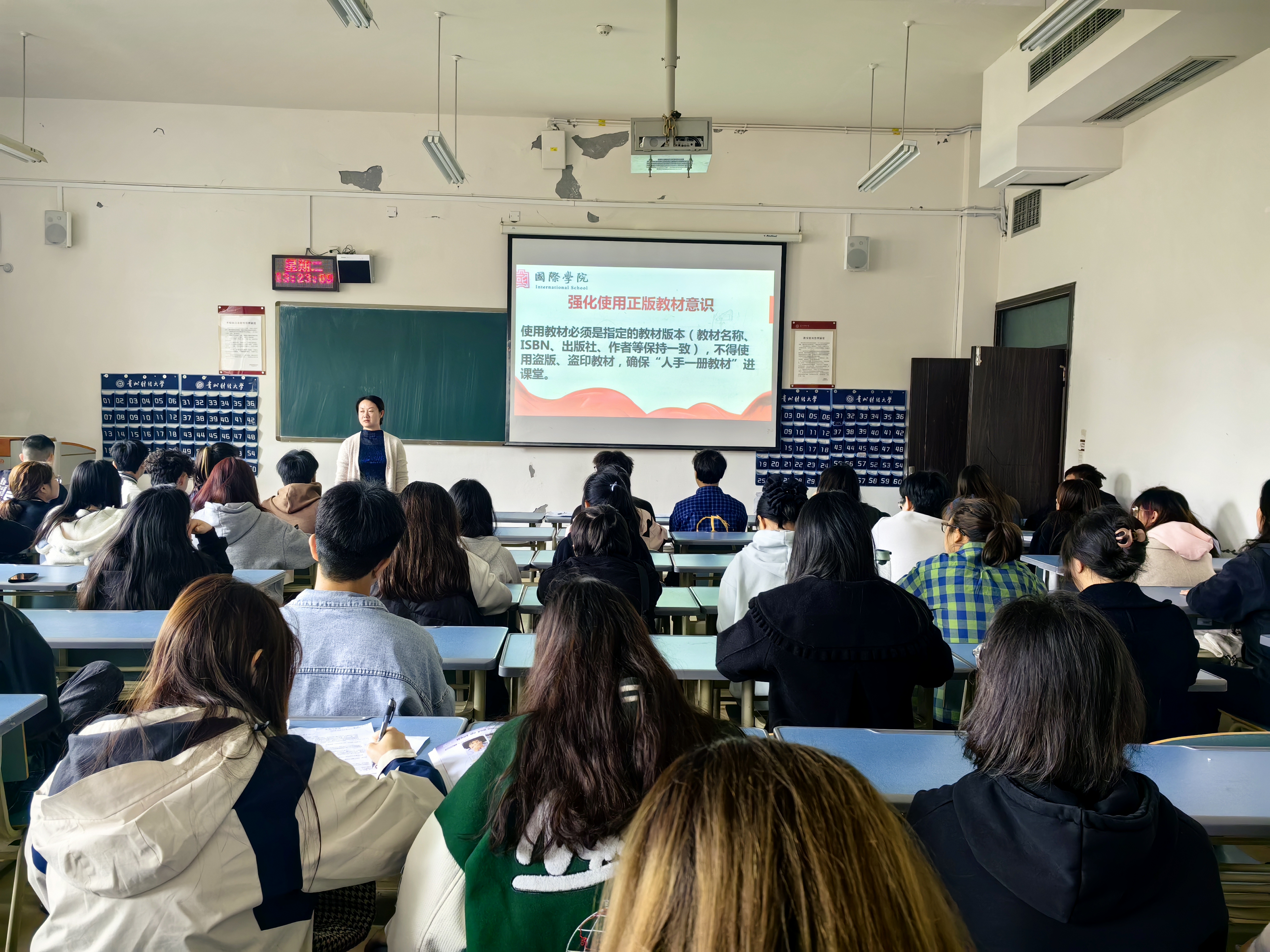 最后,刘利音对本学期同学们的学习态度和精神面貌表示肯定,希望同学们能继续保持,并在今后的学习中严格要求自己,遵守课堂教学纪律,做好表率作用,带动班级同学的学习,圆满完成各项学习任务;也希望同学们做一个自律的人,能更好地生活,为自己的目标努力奋斗。