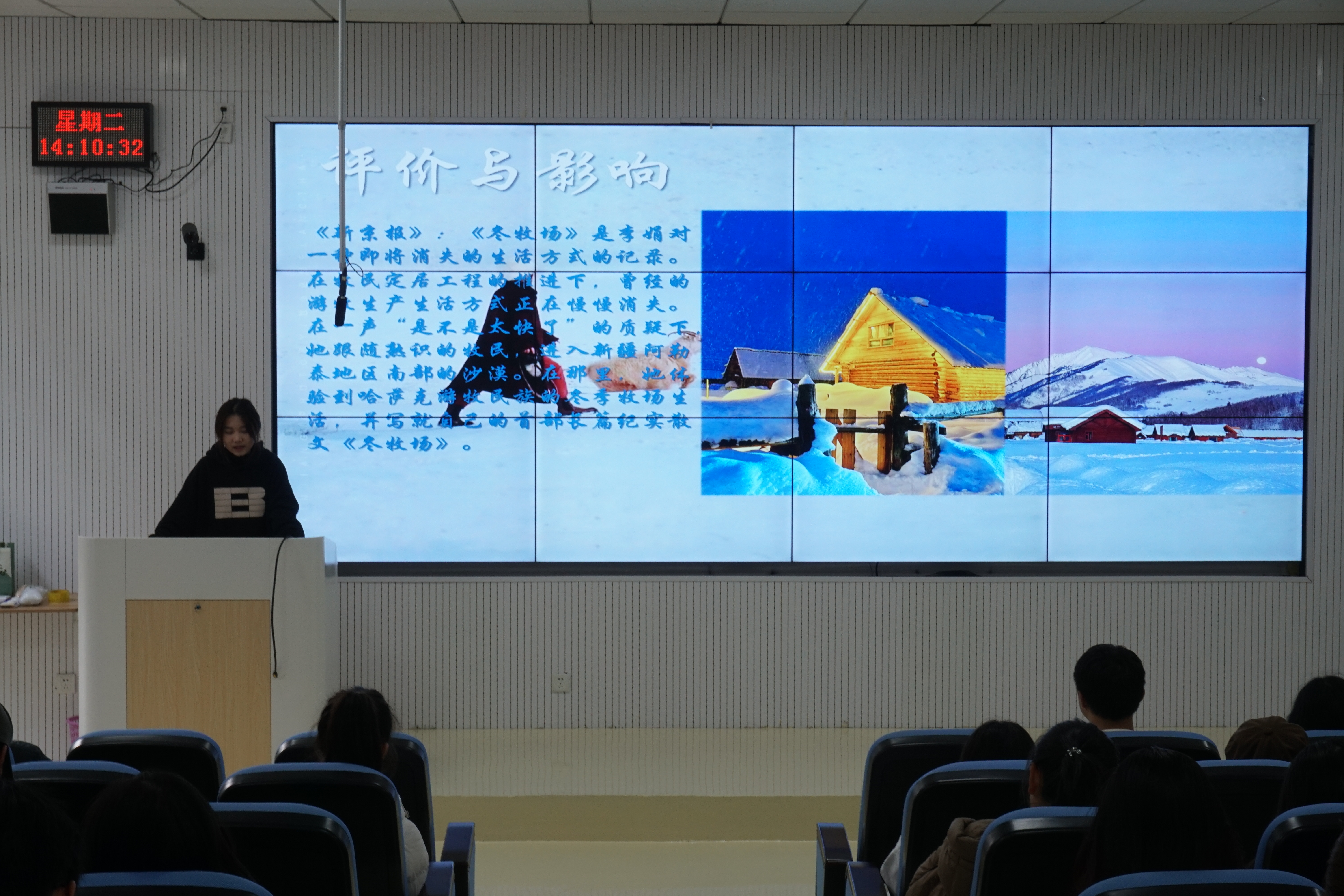 活动当天,现场气氛热烈而温馨。主持人简要介绍了本次活动的主题与流程,为活动拉开了序幕。随后,十位同学依次上台,分享了《冬牧场》《雪山大地》《雪国》《冬日笔记》等冬日相关书籍的心得体会。同学们通过生动详细的阐述,带领现场观众一同走进了书中的世界,感受了文学独特的韵味。从书中的情节设置、人物形象,到作者的写作手法、作品所传达的情感与思想,每一位分享者都进行了深入的剖析和解读。他们的精彩分享,不仅展现了个人的阅读理解和思考能力,也激发了现场观众的阅读热情,在交流与探讨中,同学们的思维得到了激烈的碰撞与深刻的启发。