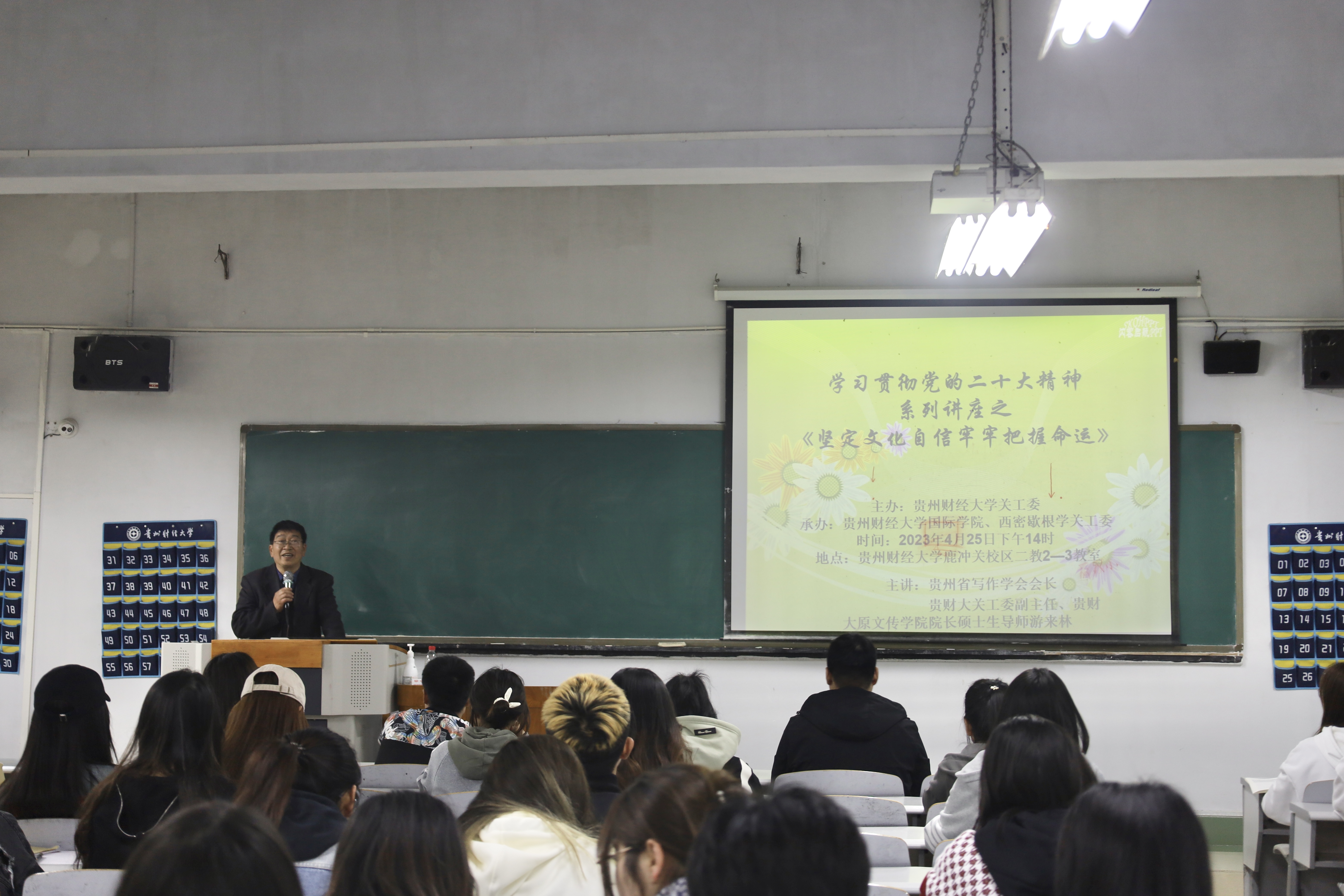 (永利3044集团官网 孔令巧 报道|摄影 罗佳颖)为深入学习宣传贯彻党的二十大精神,坚定不移推进文化自信自强,4月25日,永利3044集团官网邀请贵州省写作学会会长、3044永利集团集团关工委副主任、硕士生导师游来林老师,在鹿冲关校区第二教学楼合2-2教室开展学习贯彻党的二十大精神系列讲座之《坚定文化自信牢牢把握命运》主题讲座。