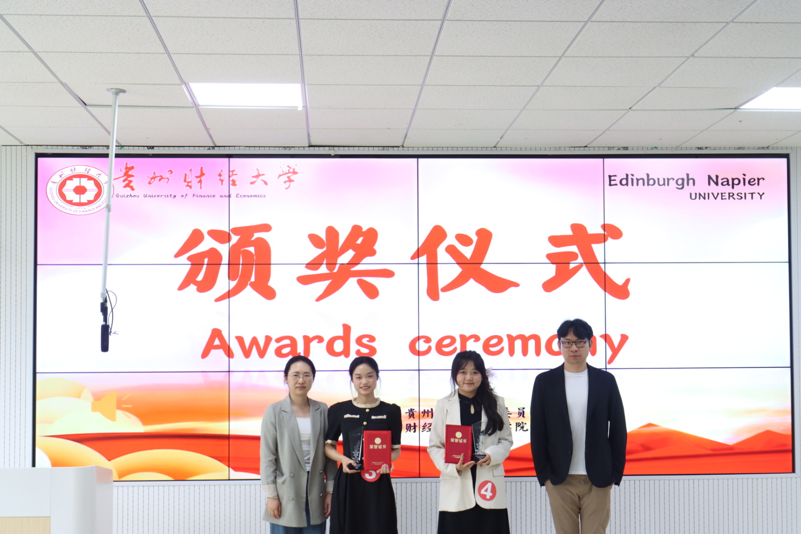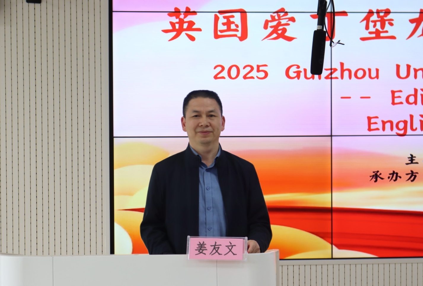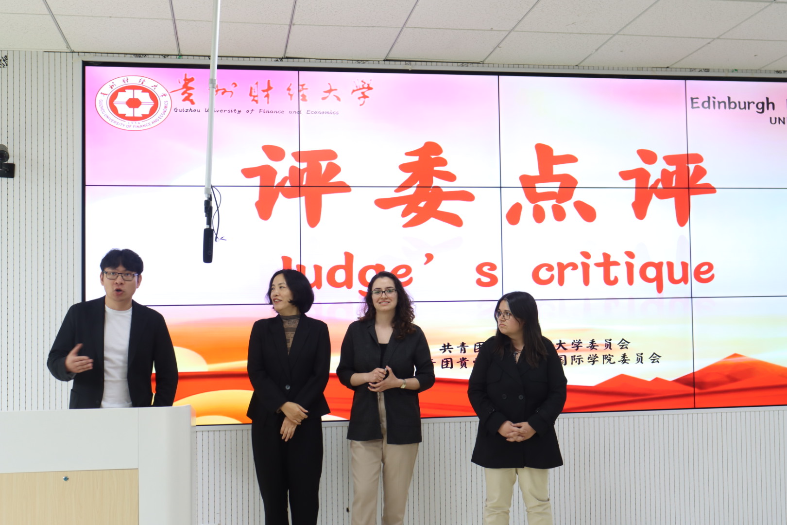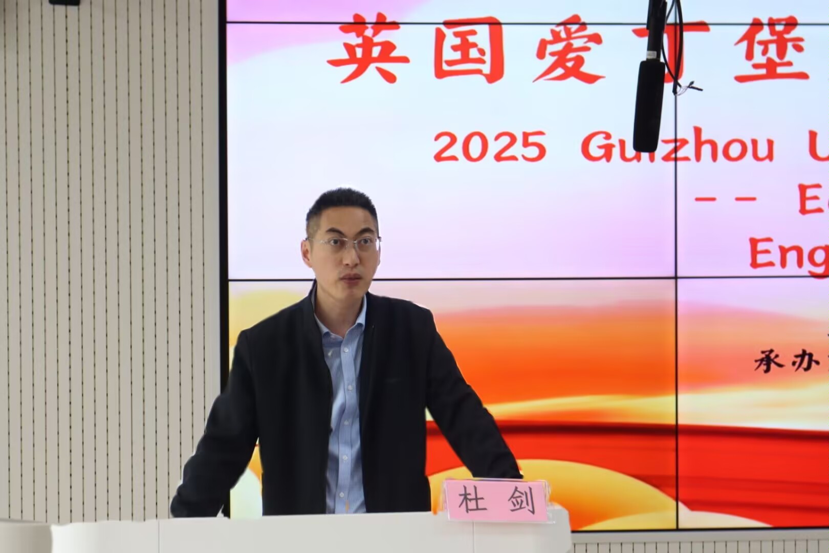 杜剑致辞,他代表公司向远道而来的英国龙比亚大学教师表示热烈的欢迎,向进入决赛的同学们表示衷心的祝贺,同时对同学们提出三点希望:一是夯实英语根基,提升跨文化交流沟通能力。希望同学们充分认识外语学习的重要性,掌握好外语这一跨文化沟通和交流的重要媒介,在全球化的浪潮中努力提高外语水平,加强表达能力,提升综合素质,彰显贵财学子饱满向上的精神风貌;二是以文化铸魂,坚定“四个自信”。希望同学们讲好新时代中国的伟大成就和巨大变革,传播好中国道路和中国方案,阐释好中国理论和中国实践,讲好中国故事,向合作院校师生展示可信、可敬、可爱的中国形象;三是以交流搭桥,促进国际交流合作。希望同学们积极参加国际学术与文化活动月相关活动,了解学术热点,感悟多元文化,开拓国际视野,赋能个人成长。