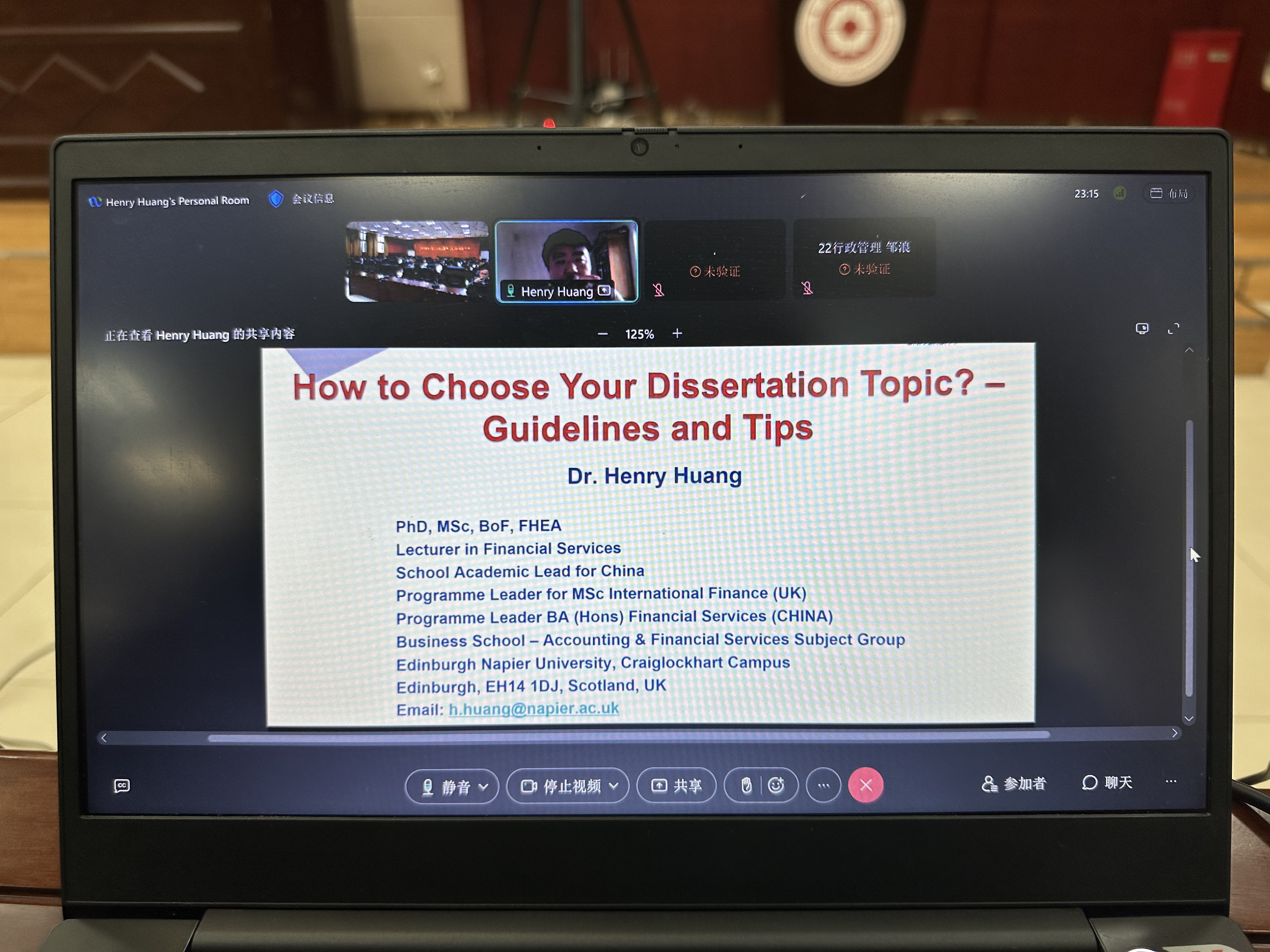 (永利3044集团官网 邓莹 图文报道)5月8日晚,英国爱丁堡龙比亚大学教师、中国区学术带头人、国际金融理学硕士(英国)和金融服务(荣誉)文学学士(中国)项目负责人,伦敦银行与金融公司外部审查员黄享利博士应邀作题为“国外高校本科学术论文写作”的讲座。本次讲座以线上线下同步开展,公司150余名师生参加,讲座由永利3044集团官网副经理刘利音副教授主持。